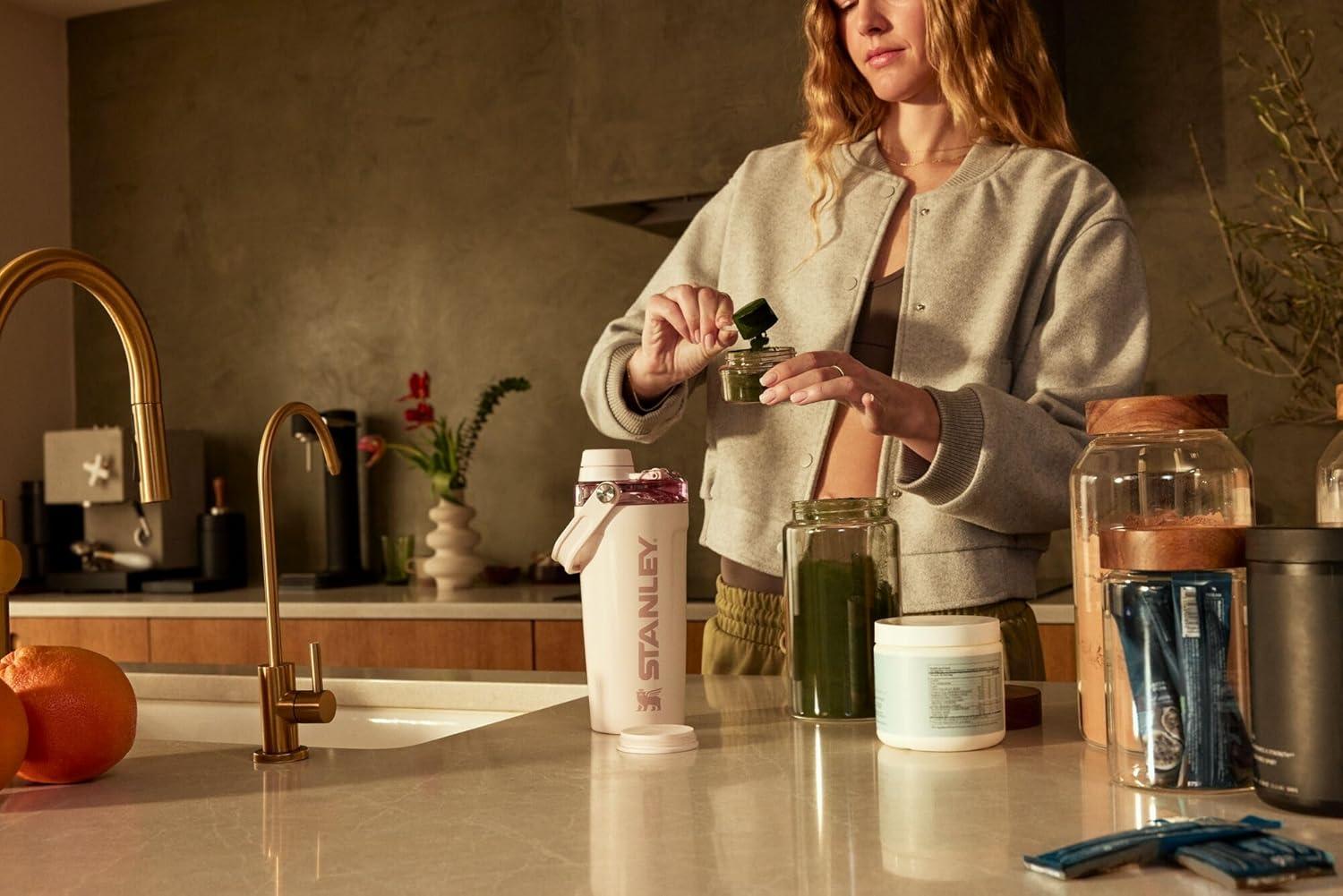 image:imageSTANLEY Vitalize Shaker Bottle 20 oz  Leakproof Insulated Stainless Steel Shaker Cup  Base Storage and Twist On Fast Flow Lid  Protein Shakes and Pre Workout Powder  BPAFree  Chili BlackAzure