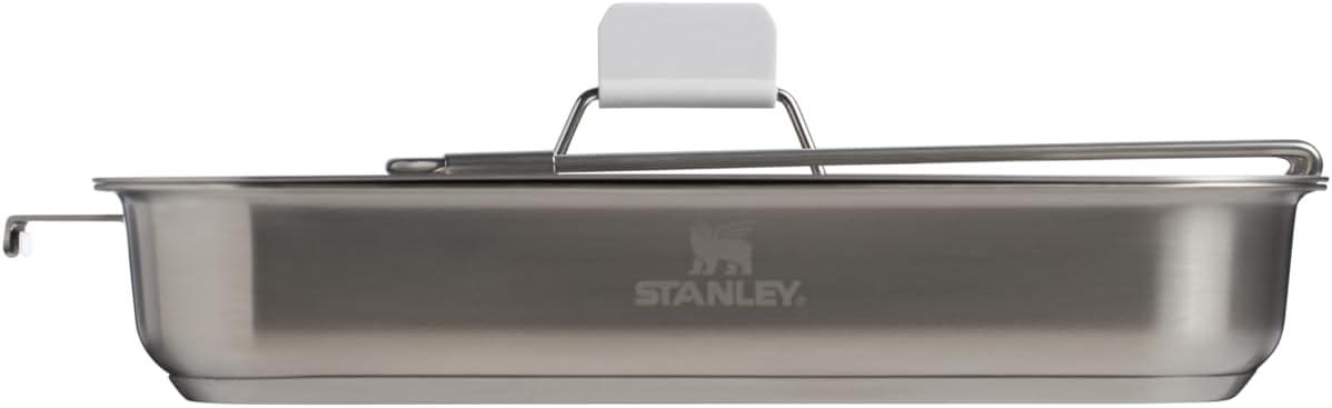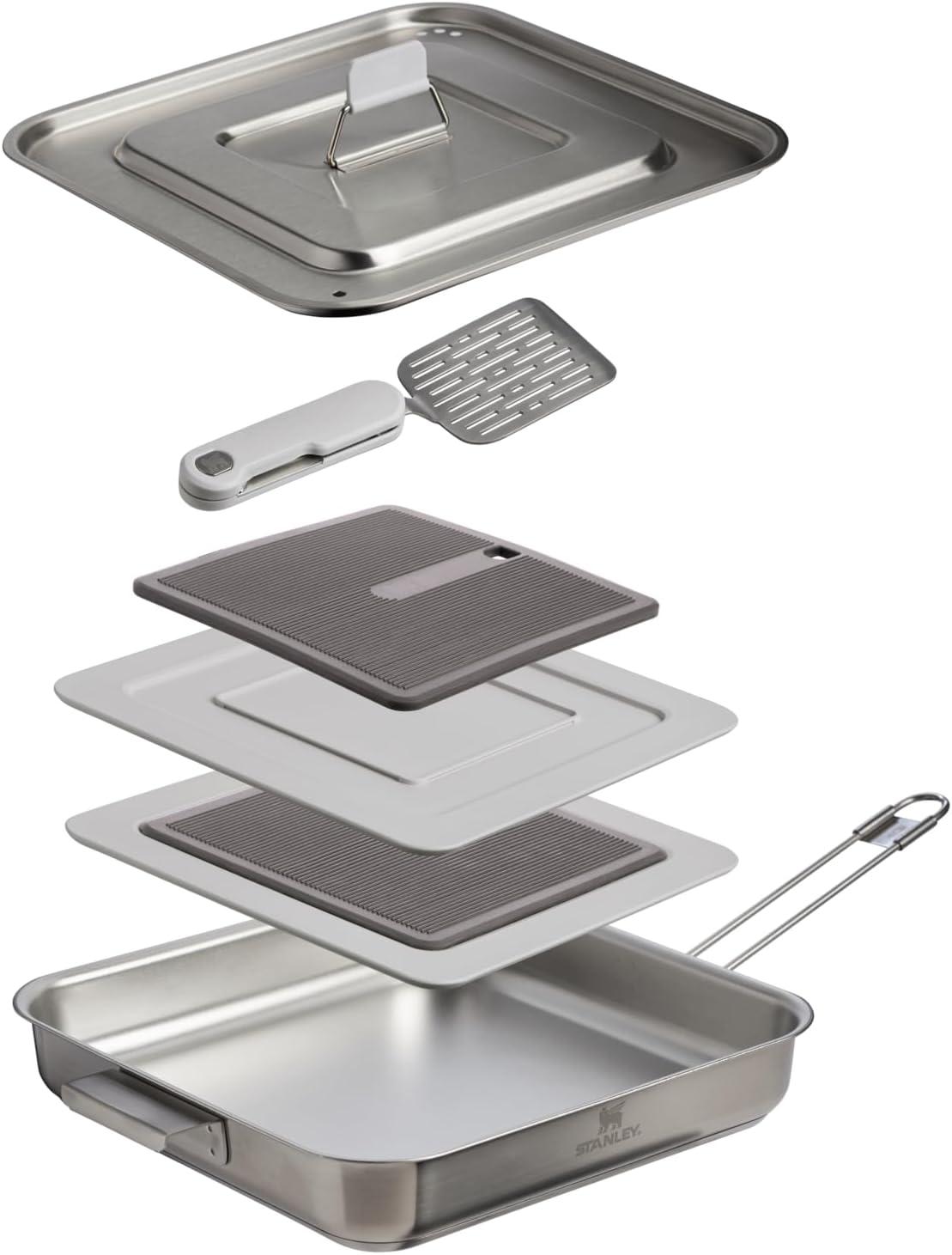 VERSATILE COOKSET: This 5-piece set includes all the essential camping cooking items. The sturdy cookware features a stainless steel square pan with three layers, a lid, cutting board, trivet, and folding spatula.